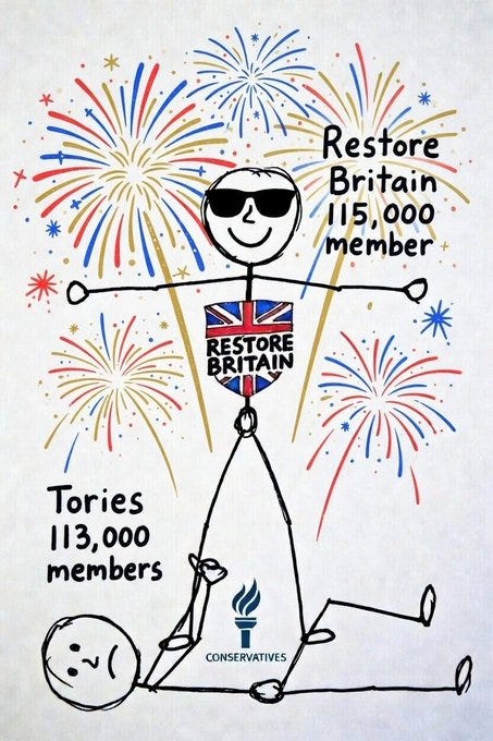 Membership numbers: Restore Britain 115,000. Conservatives 113,000.