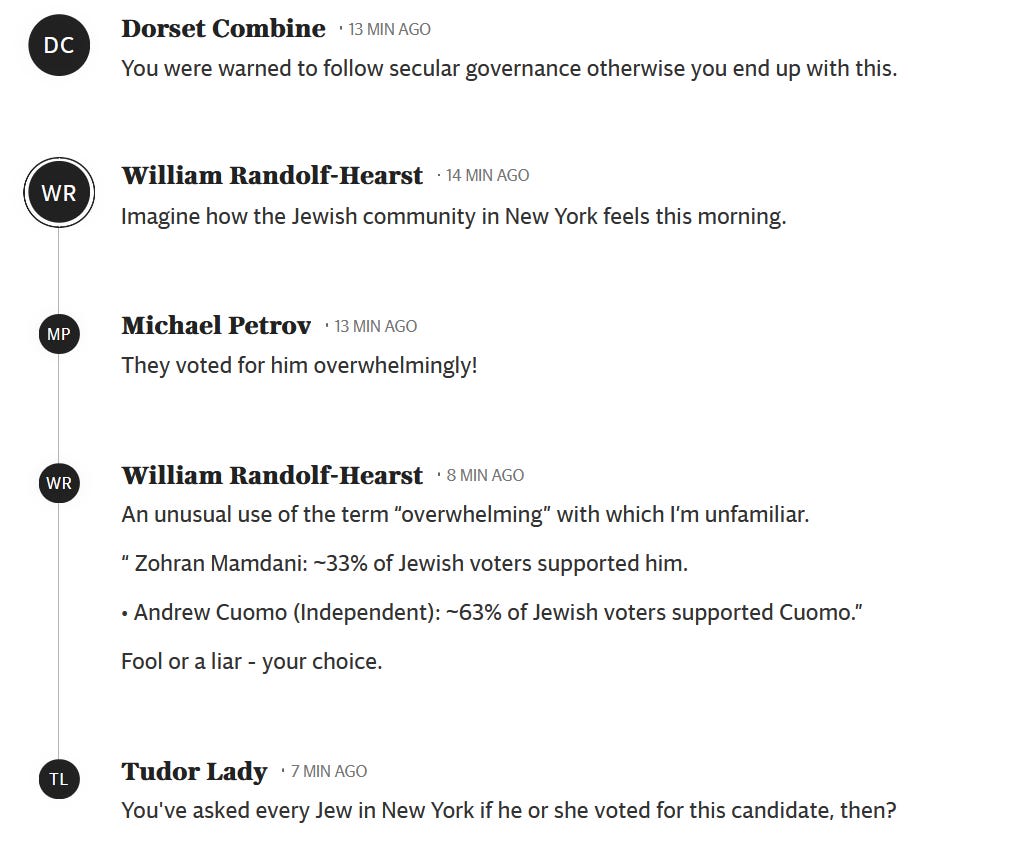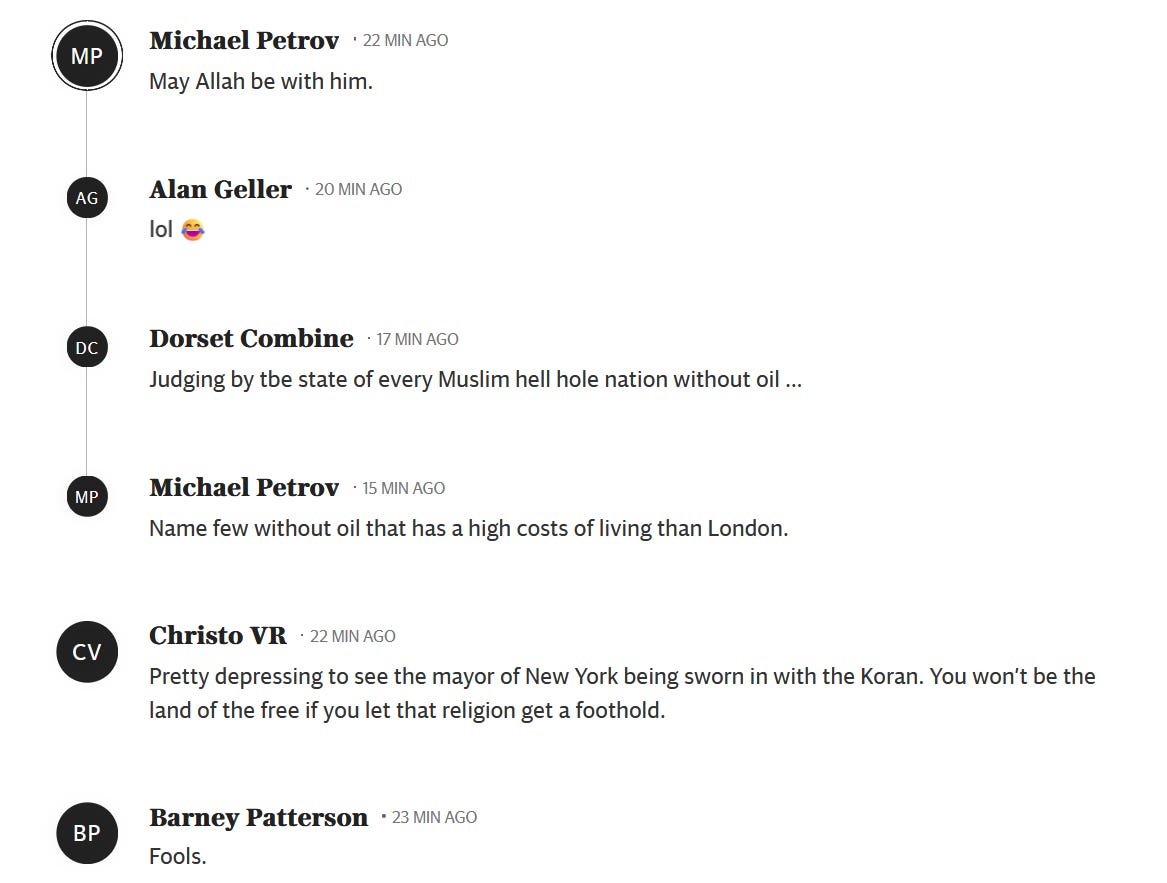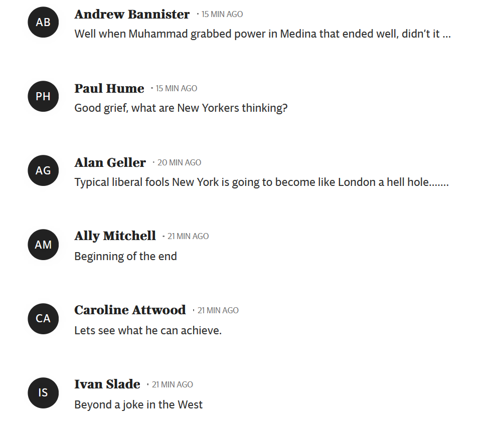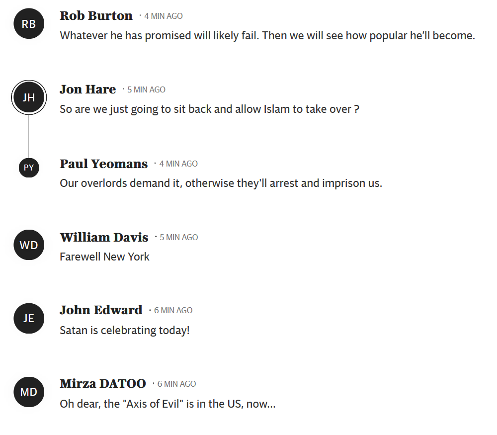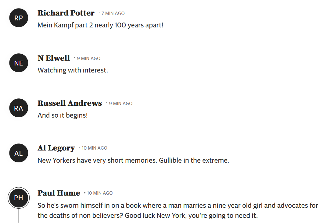 The swearing on the Quran is so telling. A horrible, violent book. He believes its tenets. New York doesn't care for subtleties of thought. It is a brutal, aggressive, arrogant city. Always was .His success is as arbitrary as so many American successes. It's a " made in America" system . In his case, very specifically, the list is short: he promised free stuff; he had a wounded , unimpressive opponent, an idiotic Republican candidate who refused to fold, he spit on Trump, and immigrant New Yorkers love his Jew and Israel hatred. The Jews that voted for him are a disgrace.