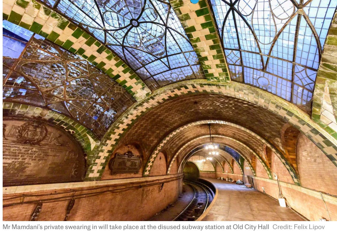 As well as using Islam’s holiest book, the self-proclaimed democratic socialist chose a disused gilded age subway station at Old City Hall as the setting to symbolise the city’s ability to think big and as a nod to the workers who keep modern New York running.
